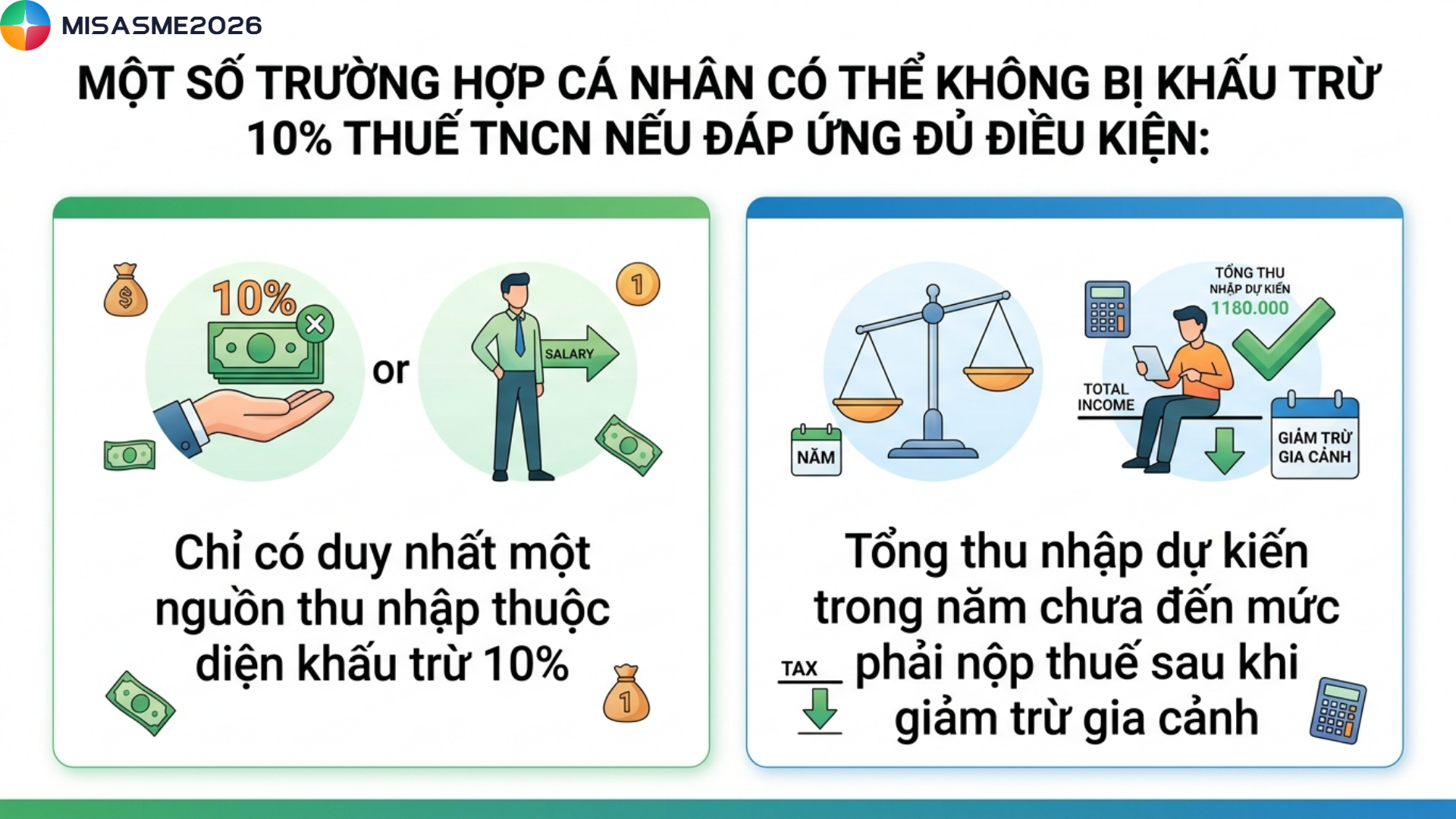 Bạn đang tìm hiểu cách tính khấu trừ 10% thuế TNCN áp dụng trong trường hợp nào và tính ra sao? Nhiều cá nhân và doanh nghiệp vẫn nhầm lẫn giữa khấu trừ 10% và biểu thuế lũy tiến, dẫn đến sai sót khi chi trả thu nhập. Đừng để sai sót thuế làm ảnh hưởng đến quyền lợi của bạn – tìm hiểu ngay cách tính đúng và quy định mới nhất 2026 trong bài viết dưới đây của phần mềm kế toán MISA SME