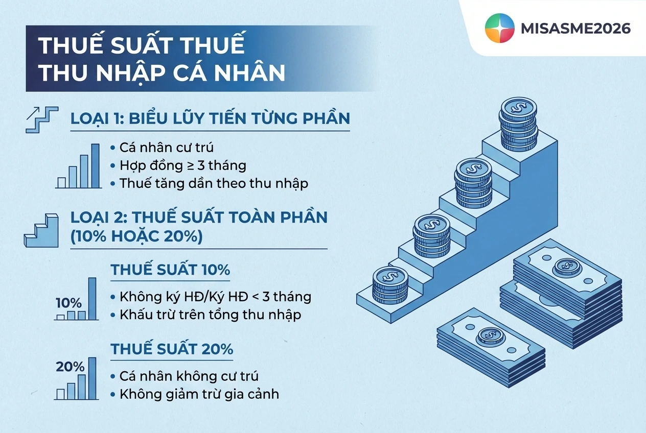 Trong bài viết này, phần mềm kế toán MISA SME sẽ tổng hợp đầy đủ các loại thuế suất TNCN, bảng tính thuế mới nhất từ năm 2026, kèm theo ví dụ minh họa cụ thể.