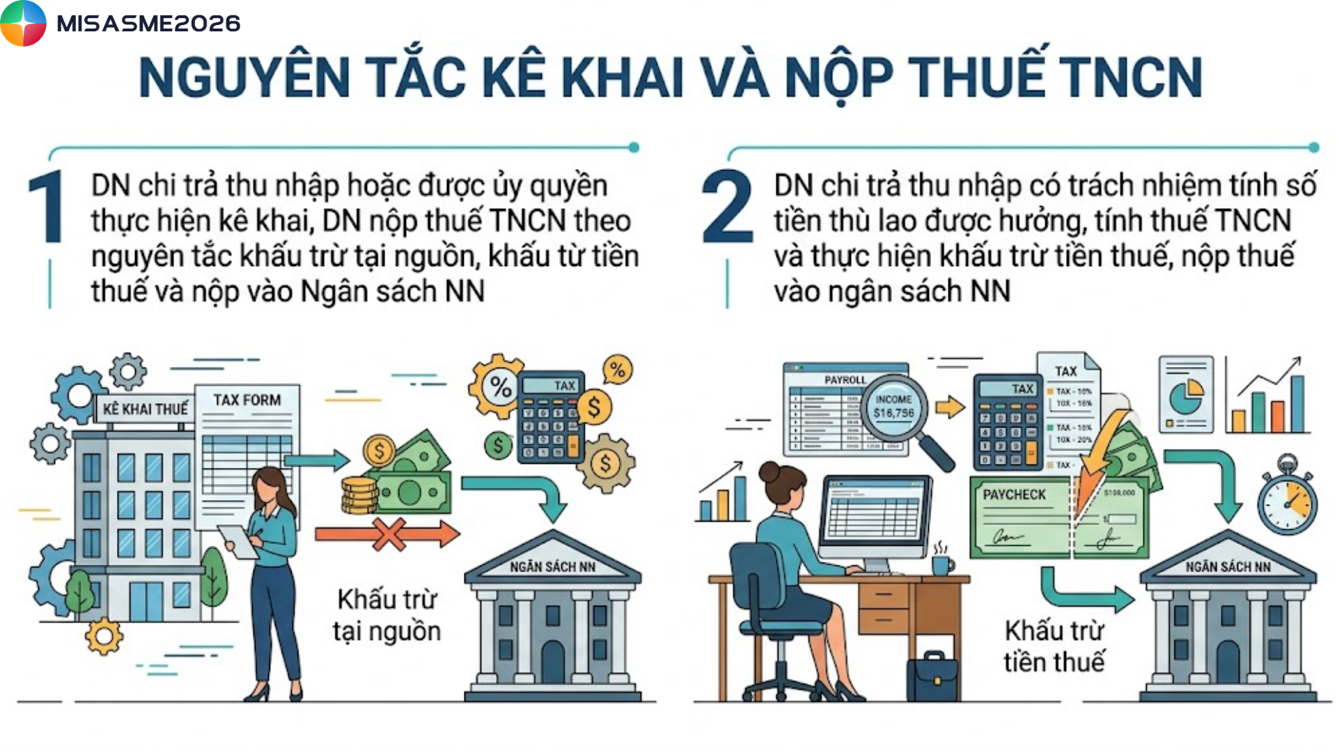 Khi hạch toán thuế TNCN phải tuân theo nguyên tắc khấu trừ tại nguồn. Doanh nghiệp chi trả thu nhập hoặc đơn vị được ủy quyền có trách nhiệm khấu trừ số thuế phải nộp trực tiếp từ thu nhập của người lao động trước khi chi trả. Đồng thời, doanh nghiệp thực hiện nộp vào Ngân sách Nhà nước theo quy định.