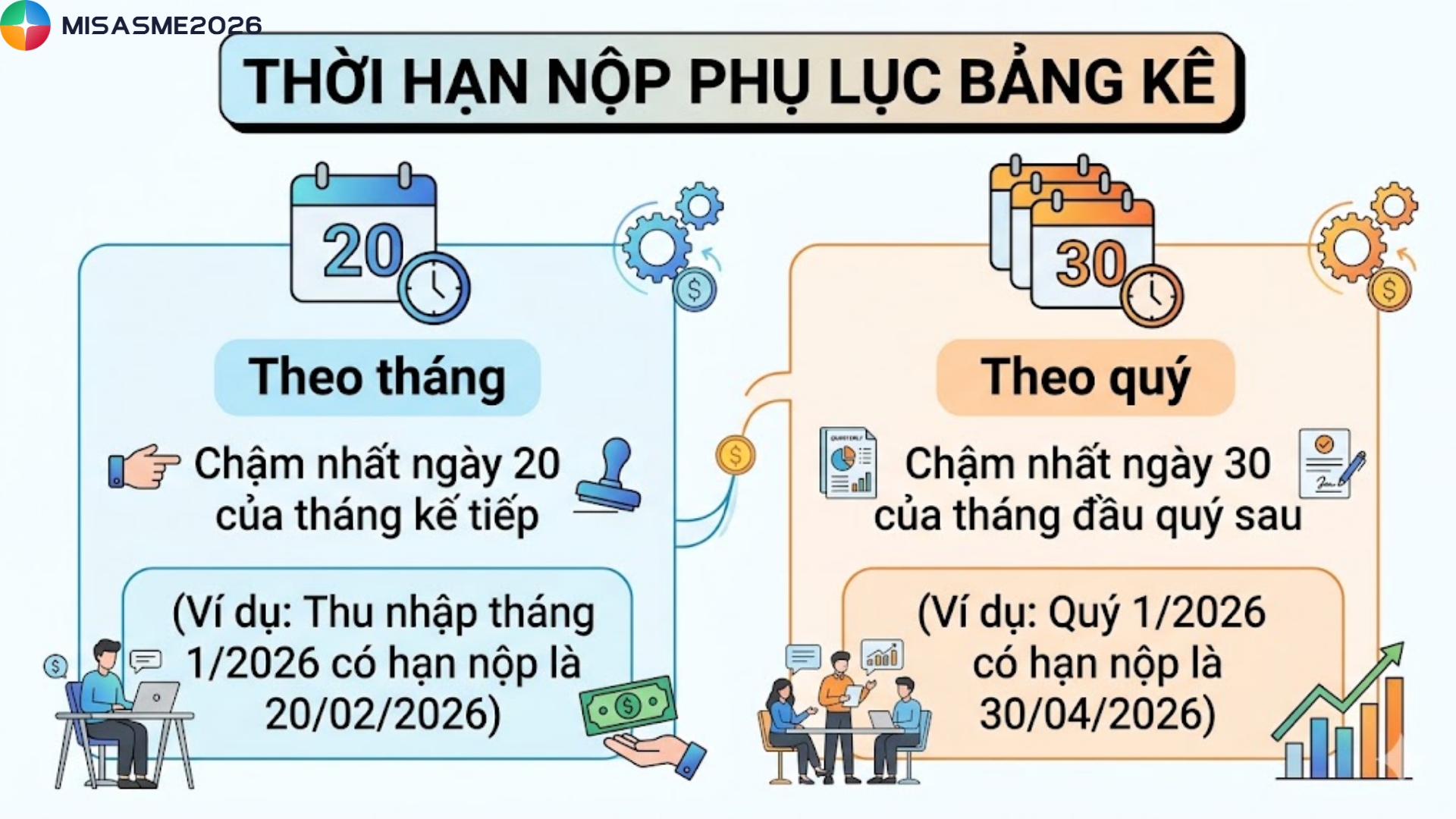 - Theo tháng: Chậm nhất ngày 20 của tháng kế tiếp (Ví dụ: Thu nhập tháng 1/2026 có hạn nộp là 20/02/2026)