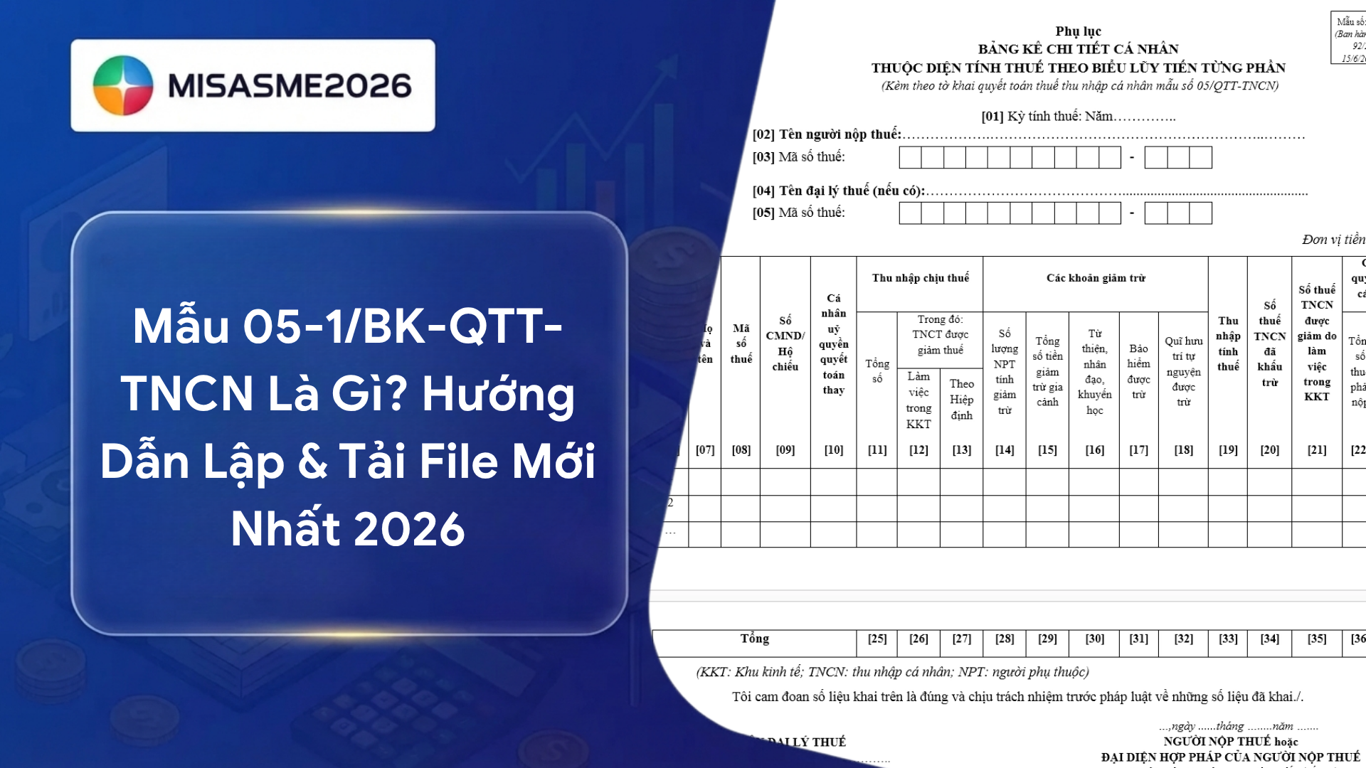 Bạn đang loay hoay khi lập mẫu 05-1/BK-QTT-TNCN nhưng chưa hiểu rõ cách kê khai, đối tượng áp dụng hay dễ gặp sai sót khi quyết toán thuế? Đây là một trong những phụ lục quan trọng, ảnh hưởng trực tiếp đến tính chính xác của hồ sơ quyết toán thuế TNCN của doanh nghiệp. Để nắm rõ chi tiết về cách lập phụ lục bảng kê, hạn chế tối đa rủi ro sai sót khi kê khai. Hãy cùng tìm hiểu qua bài viết dưới đây của phần mềm kế toán MISA SME.