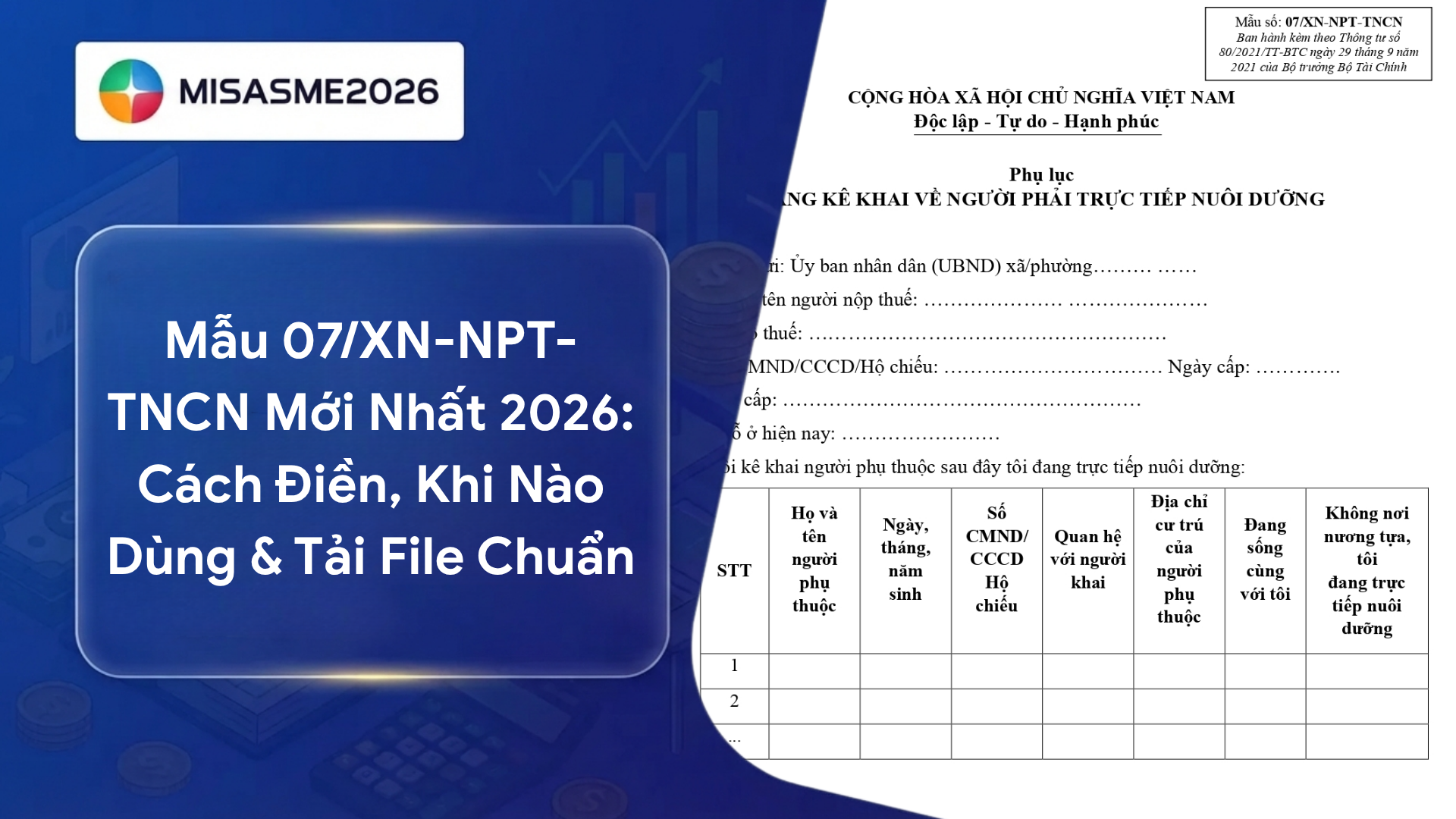 Trong quá trình đăng ký người phụ thuộc để giảm trừ gia cảnh, không ít người gặp khó khăn khi thiếu giấy tờ chứng minh quan hệ nuôi dưỡng. Lúc này, mẫu 07/XN-NPT-TNCN trở thành giải pháp quan trọng giúp hoàn thiện hồ sơ theo đúng quy định của cơ quan thuế. Tuy nhiên, không phải ai cũng hiểu rõ khi nào cần dùng, cách điền ra sao và tải mẫu chuẩn ở đâu. Xem ngay bài viết dưới đây của phần mềm kế toán MISA SME để nắm đầy đủ hướng dẫn về mẫu 07/XN-NPT-TNCN, tránh sai sót và tiết kiệm thời gian khi kê khai.
