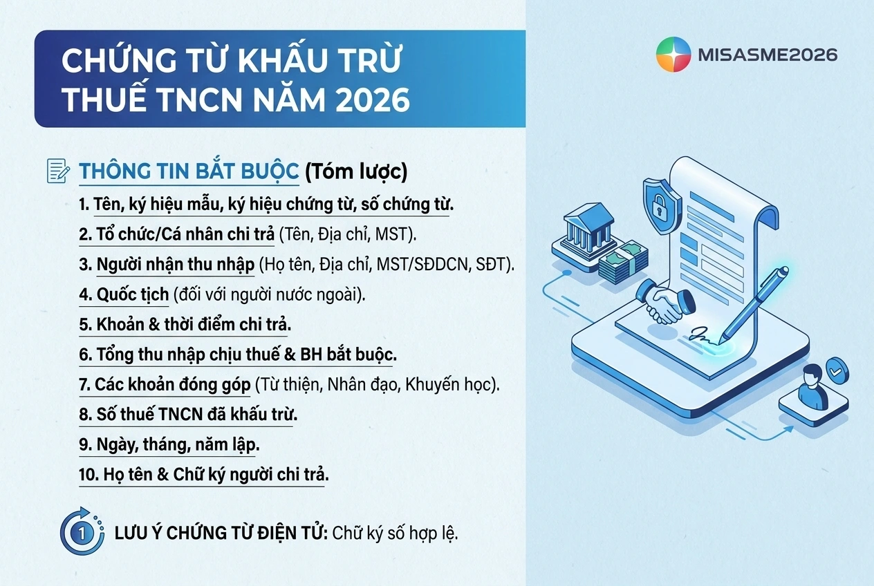 Chứng từ khấu trừ thuế TNCN năm 2026 cần thể hiện đầy đủ các thông tin sau: