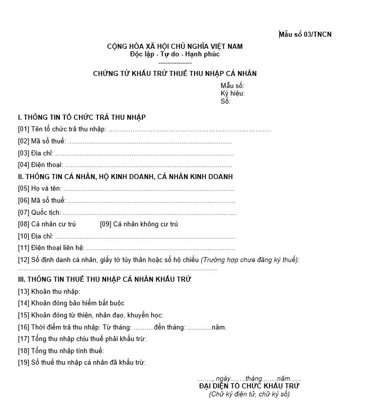 Từ năm 2026, mẫu chứng từ khấu trừ thuế thu nhập cá nhân (TNCN) điện tử mới nhất là Mẫu số 03/TNCN, được quy định tại Phụ lục III ban hành kèm theo Nghị định 123/2020/NĐ-CP, đã được sửa đổi, bổ sung bởi Nghị định 70/2025/NĐ-CP.