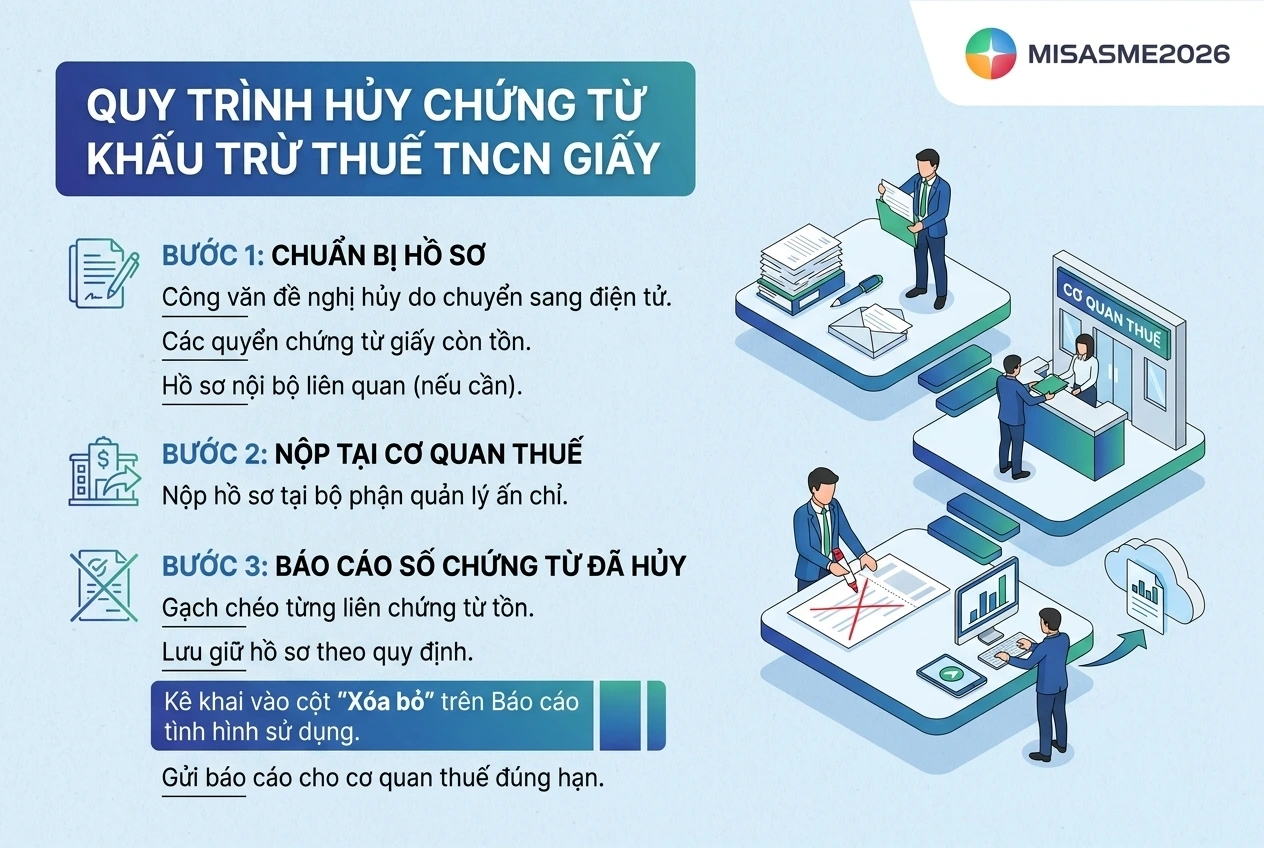 Trong trường hợp doanh nghiệp còn tồn chứng từ khấu trừ thuế TNCN bản giấy và cần chuyển sang sử dụng chứng từ điện tử theo quy định mới, đơn vị cần thực hiện thủ tục hủy chứng từ chưa sử dụng theo hướng dẫn của cơ quan thuế quản lý trực tiếp.