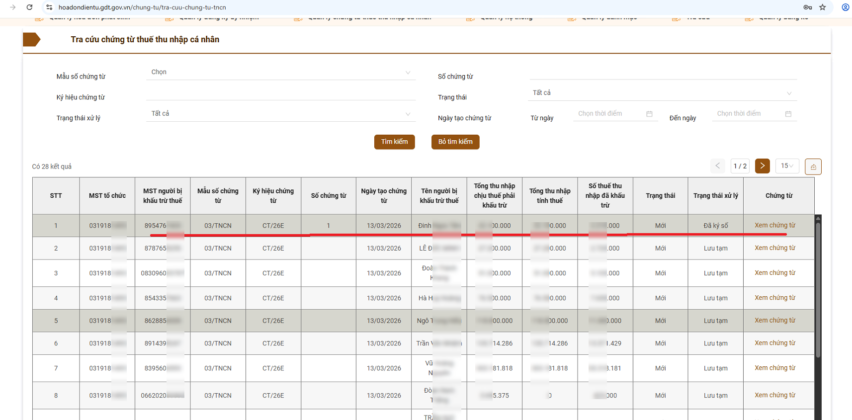 Bước 3: Tra cứu chứng từ khấu trừ thuế TNCN