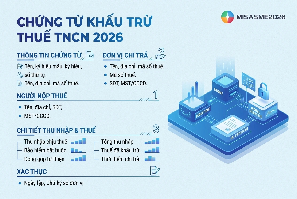 Bài viết dưới đây phần mềm kế toán MISA SME sẽ hướng dẫn chi tiết cách tra cứu chứng từ khấu trừ thuế TNCN đối với doanh nghiệp và cá nhân, đồng thời cập nhật nội dung bắt buộc trên chứng từ điện tử cũng như quy định cấp chứng từ theo pháp luật hiện hành.