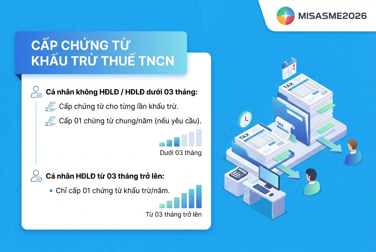 - Đối với cá nhân ký hợp đồng lao động từ 03 tháng trở lên, tổ chức trả thu nhập chỉ cấp 01 chứng từ khấu trừ thuế TNCN trong một năm tính thuế.
