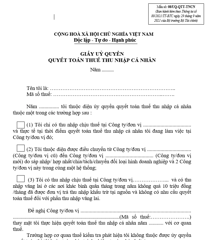 • Giấy ủy quyền quyết toán thuế TNCN mẫu số 08/UQ-QTT-TNCN ban hành kèm theo Thông tư 80/2021/TT-BTC.