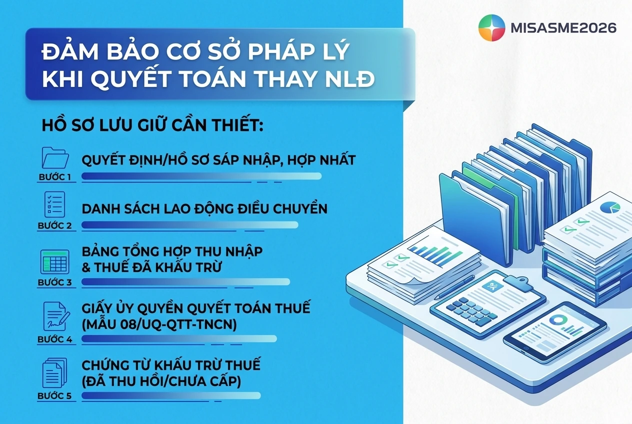 Để bảo đảm cơ sở pháp lý khi quyết toán thay cho người lao động, đề nghị tổ chức nhận sáp nhập/tổ chức mới sau hợp nhất lưu giữ đầy đủ: