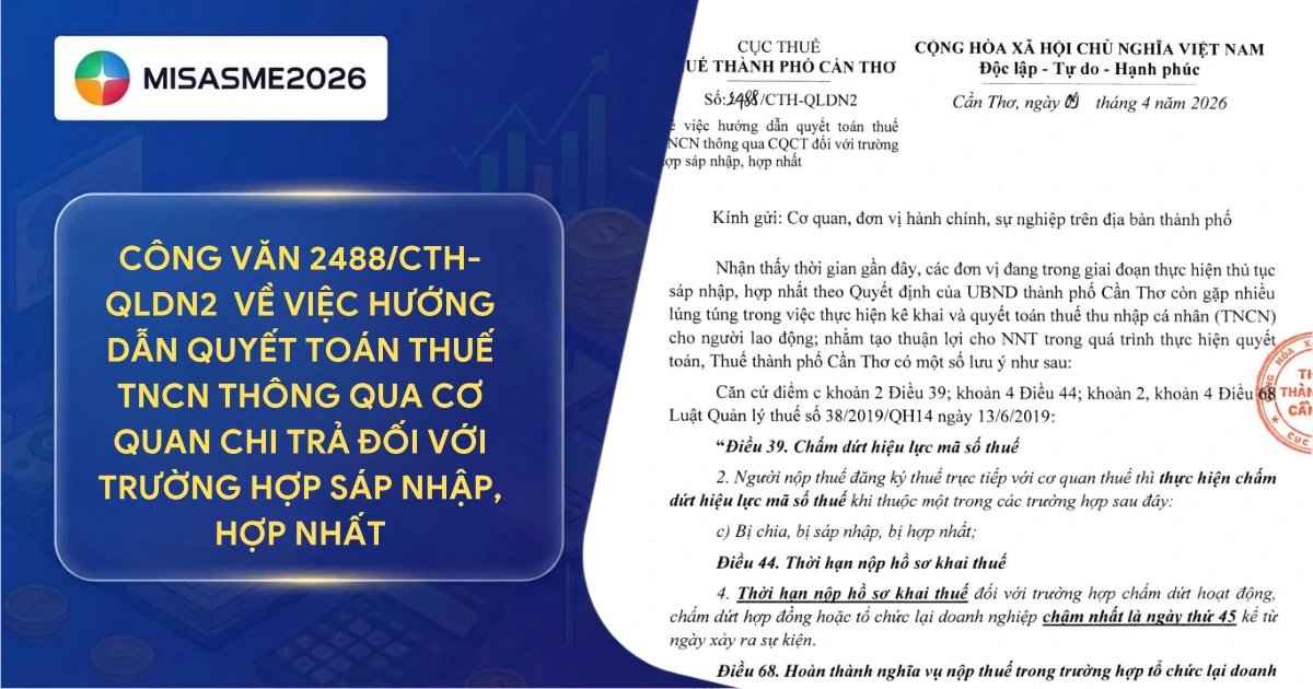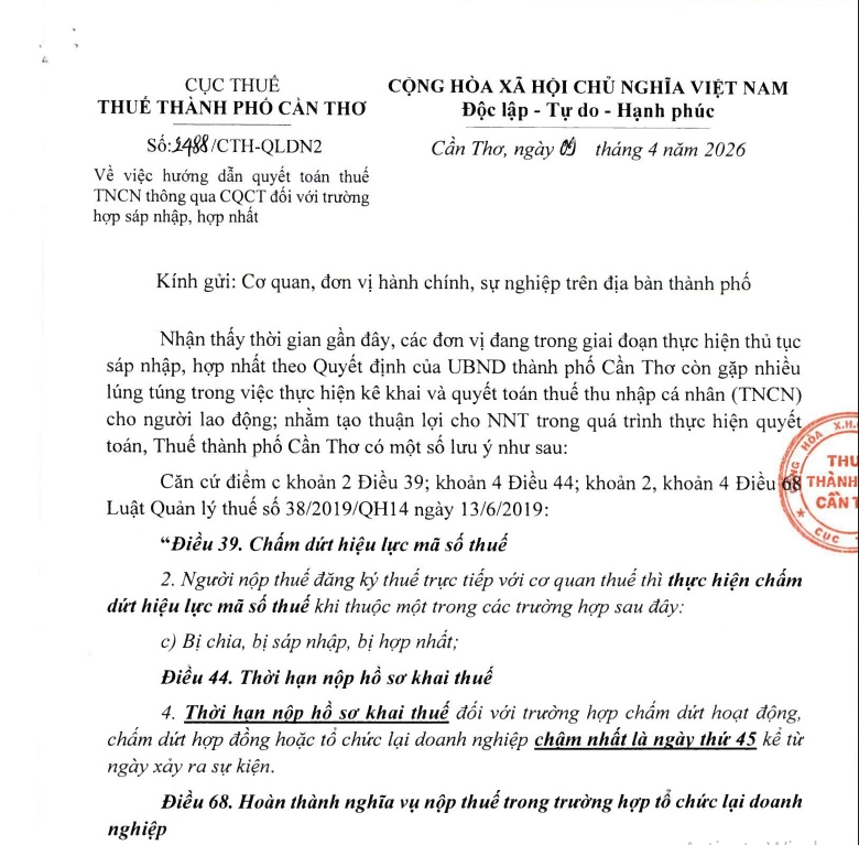 Cục Thuế TP. Cần Thơ vừa ban hành Công văn số 1488/CTH-QLDN2 ngày 09/4/2026, hướng dẫn chi tiết việc quyết toán thuế thu nhập cá nhân (TNCN) thông qua cơ quan chi trả đối với các đơn vị đang thực hiện sáp nhập, hợp nhất theo Quyết định của UBND thành phố. Đính kèm là Công văn số 1672/CTH-CNTK ngày 12/3/2026 với những lưu ý quan trọng về quyết toán thuế TNCN năm 2025, bao gồm đối tượng phải/không phải quyết toán, mức giảm trừ gia cảnh, thủ tục nộp hồ sơ, quy trình hoàn thuế tự động và các lưu ý khác.