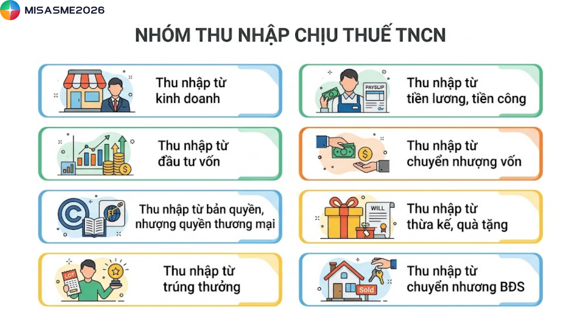 Theo quy định mới nhất, các nguồn thu nhập phải chịu thuế thu nhập cá nhân được chia thành 8 nhóm chính như sau: