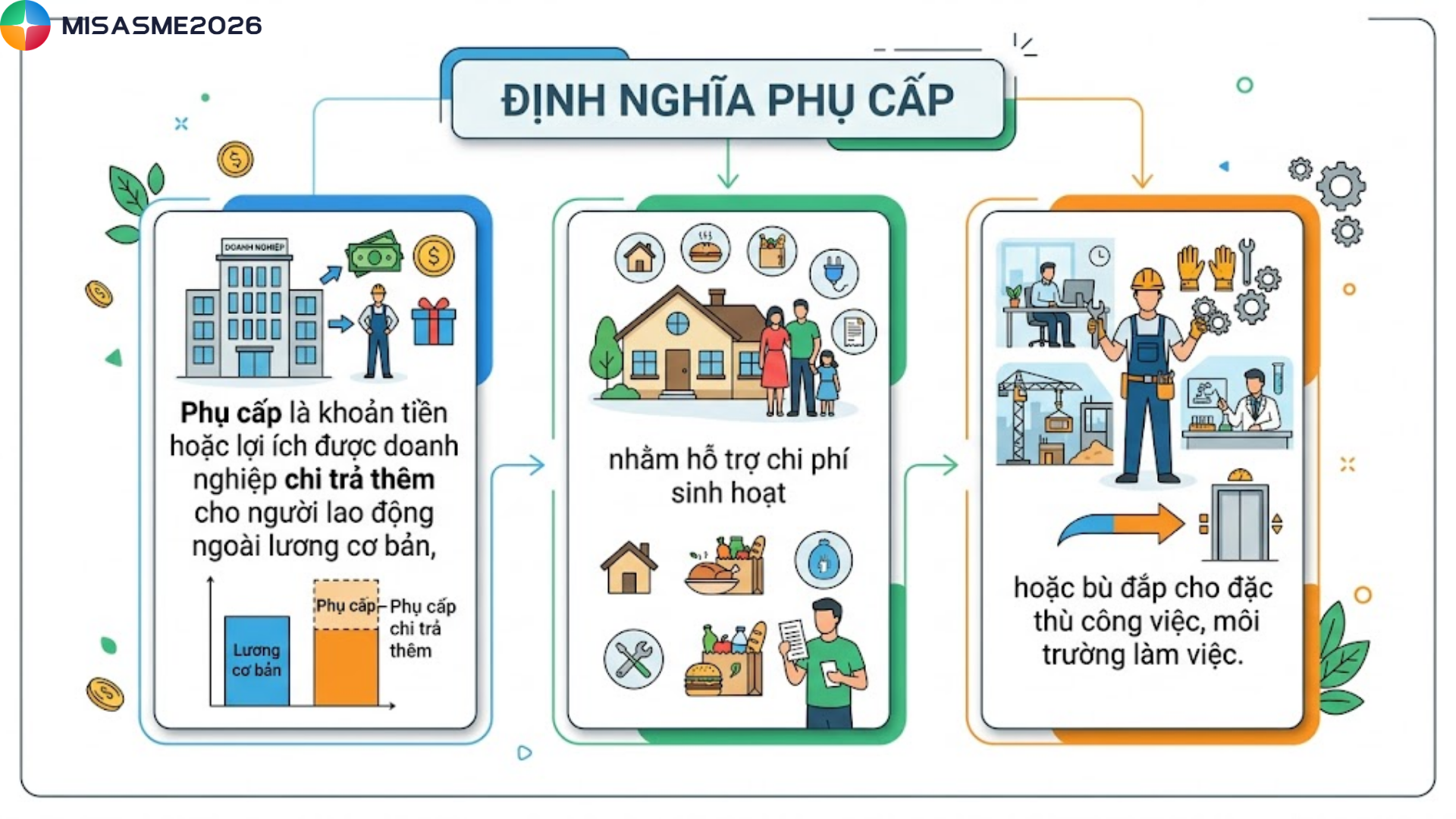 Phụ cấp là khoản tiền hoặc lợi ích được doanh nghiệp chi trả thêm cho người lao động ngoài lương cơ bản, nhằm hỗ trợ chi phí sinh hoạt hoặc bù đắp cho đặc thù công việc, môi trường làm việc. Các khoản phụ cấp này thường được quy định trong hợp đồng lao động, thỏa ước lao động tập thể hoặc theo chính sách nội bộ của doanh nghiệp.