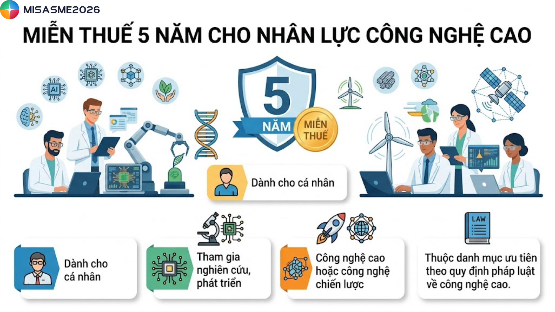 • Miễn thuế 5 năm cho nhân lực công nghệ cao: Dành cho cá nhân tham gia nghiên cứu, phát triển công nghệ cao hoặc công nghệ chiến lược thuộc danh mục ưu tiên theo quy định pháp luật về công nghệ cao.
