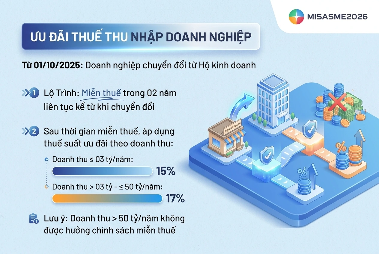 Từ ngày 01/10/2025, doanh nghiệp thành lập mới trên cơ sở chuyển đổi từ hộ kinh doanh được hưởng cơ chế ưu đãi thuế thu nhập doanh nghiệp theo lộ trình: