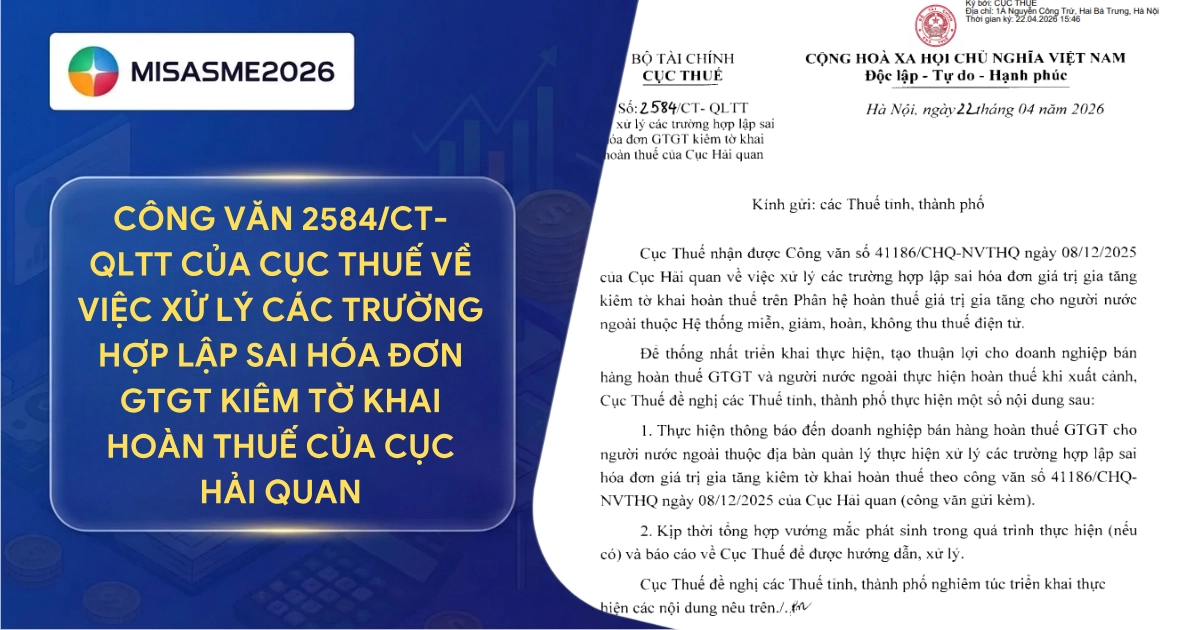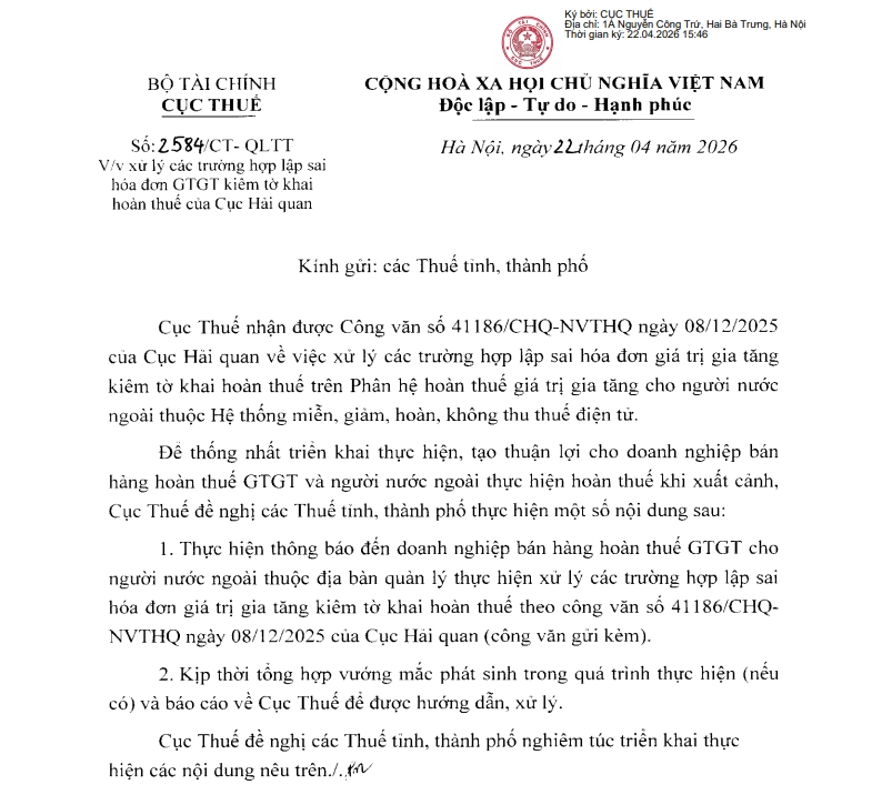 Ngày 22 tháng 4 năm 2026, Cục Thuế đã ban hành Công văn số 2584/CT-QLTT gửi các Thuế tỉnh, thành phố về việc xử lý các trường hợp lập sai hóa đơn GTGT kiêm tờ khai hoàn thuế trên Phân hệ hoàn thuế GTGT cho người nước ngoài thuộc Hệ thống miễn, giảm, hoàn, không thu thuế điện tử.