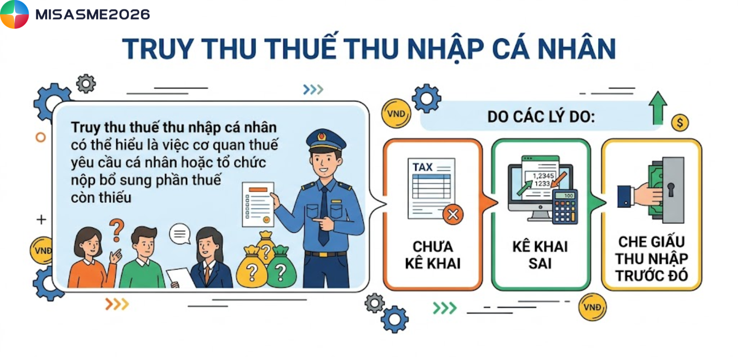 Trong quá trình kê khai và quyết toán, nhiều cá nhân dễ gặp tình trạng bị truy thu do sai sót trong khai báo thu nhập, dẫn đến phát sinh chi phí và rủi ro bị xử phạt. Vì vậy, việc hiểu rõ quy định và biết cách truy thu thuế thu nhập cá nhân online là rất cần thiết để chủ động kiểm tra và xử lý kịp thời. Hãy cùng tìm hiểu chi tiết các quy định, thời hạn và cách thực hiện trong bài viết dưới đây của phần mềm kế toán MISA SME để tránh những sai sót không đáng có.