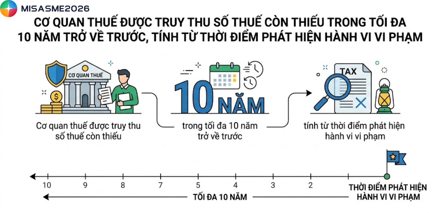 - Cơ quan thuế được truy thu số thuế còn thiếu trong tối đa 10 năm trở về trước, tính từ thời điểm phát hiện hành vi vi phạm