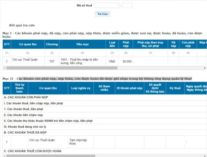 Mục II – Các khoản còn phải nộp, nộp thừa, còn được hoàn đã được ghi nhận trong hệ thống ứng dụng quản lý thuế